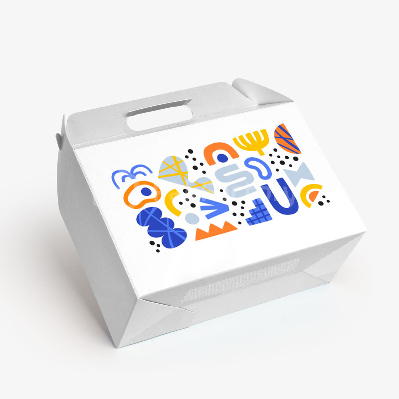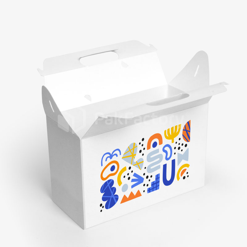 A self-locking carrier with a distinctive triangular top handle. Ideal for food, gifts or retail items.